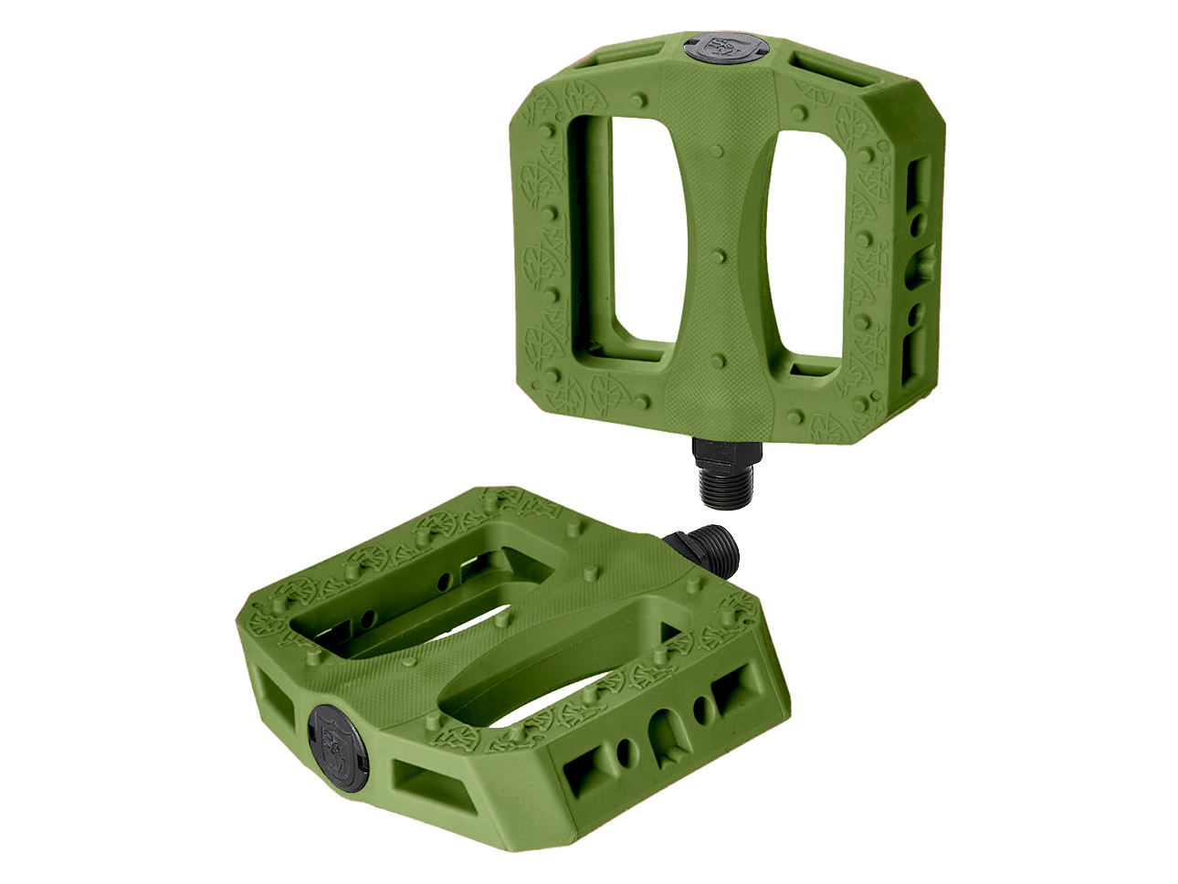 Oversized CrMo spindle for strength. Large body. Thin design. Accepts 6mm Allen, 15mm and 17mm wrench for installation/removal. Wider surface also allows use of adjustable wrench. The larger, ergonomic shape is designed for grip and support. Micro-knurled surface and molded pins for traction. Long lasting nylon/fiber blend for sliding.